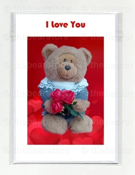 Greeting card featuring Harlow holding 3 roses on a hearts background.