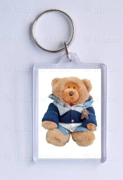 Keyring featuring Cefni bear in his blue striped jacket.