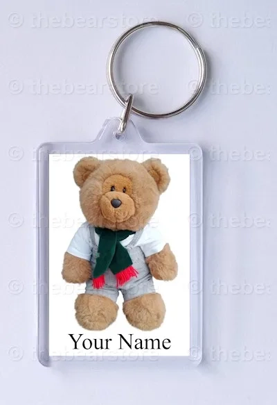 Keyring featuring Harlow in his jungle beach T shirt, grey dungarees and green scarf.