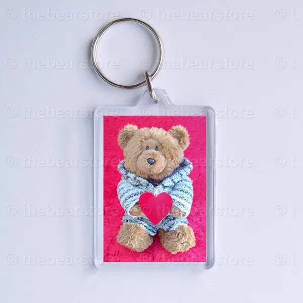 Keyring featuring Billy bear in his winter jacket holding a heart.