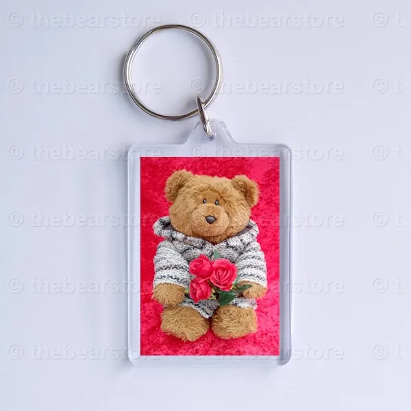 Keyring featuring Billy bear in his winter jacket holding 3 red roses.