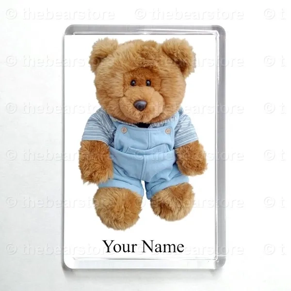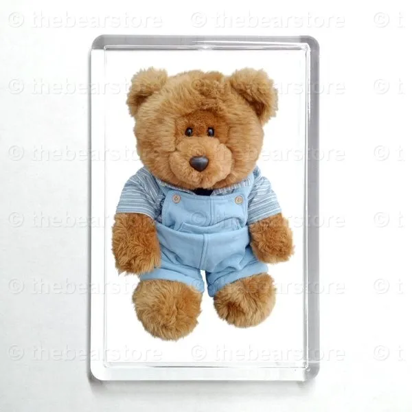 Oblong magnet featuring Fergus in his blue and yellow striped T shirt and blue dungarees.