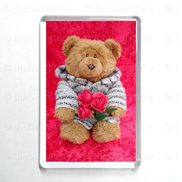 Oblong magnet featuring Billy in his winter jacket holding 3 red roses.