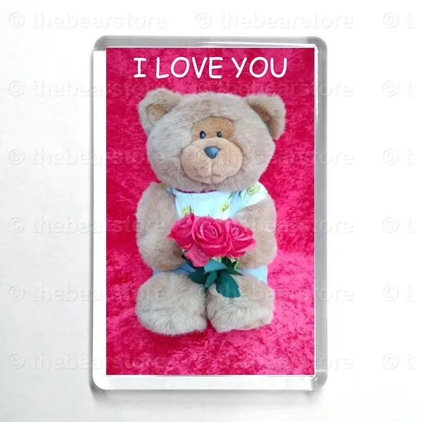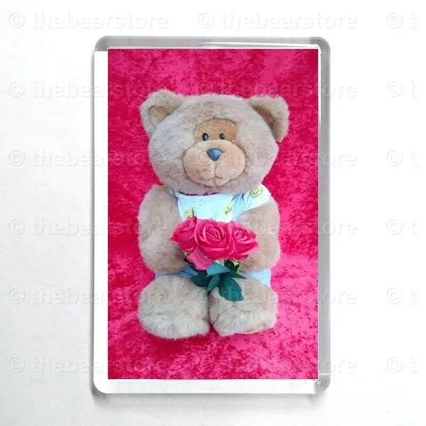 Oblong magnet featuring Riley holding 3 red roses.