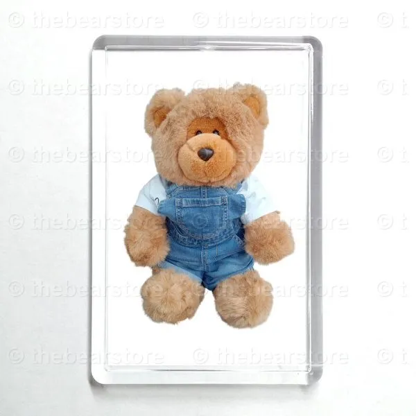 Oblong magnet featuring Leicester in his 'Winnie the Pooh' T shirt and denim dungarees.