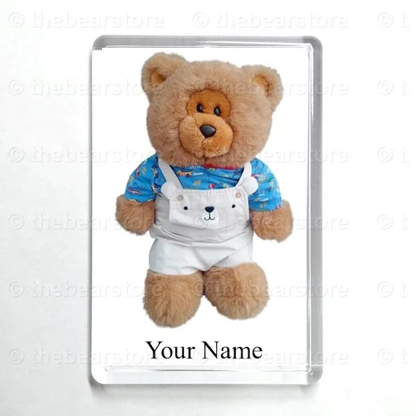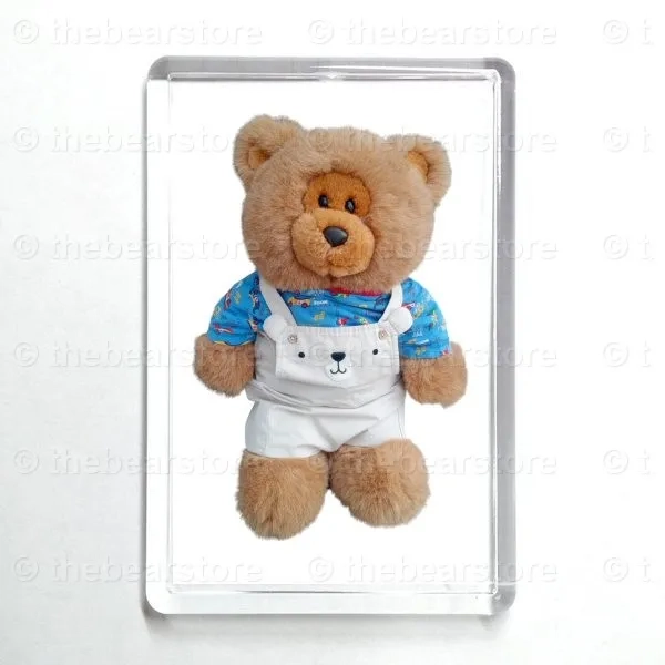 Oblong magnet featuring Roly in his 'cars' T shirt and bear dungarees.