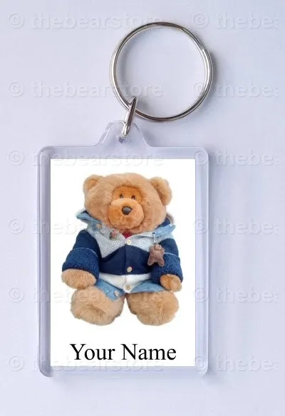 Keyring featuring Cefni bear in his blue striped jacket.