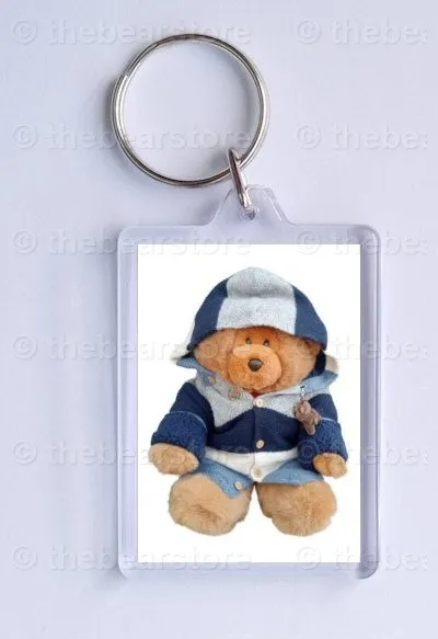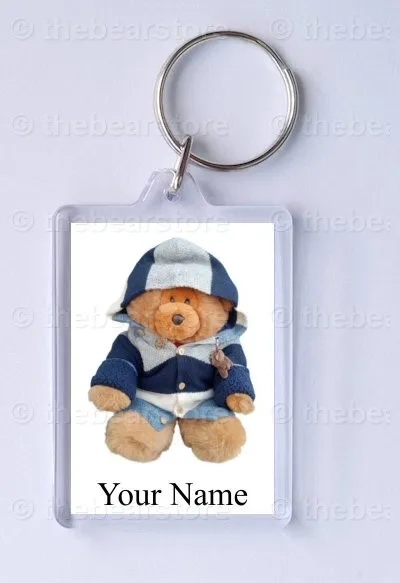 Keyring featuring Cefni bear in his blue striped jacket and hood up.