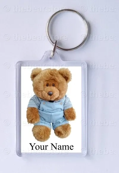 Keyring featuring Fergus in his blue and yellow striped T shirt and blue dungarees.