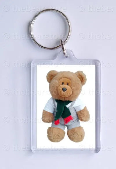 Keyring featuring Harlow in his jungle beach T shirt, grey dungarees and green scarf.
