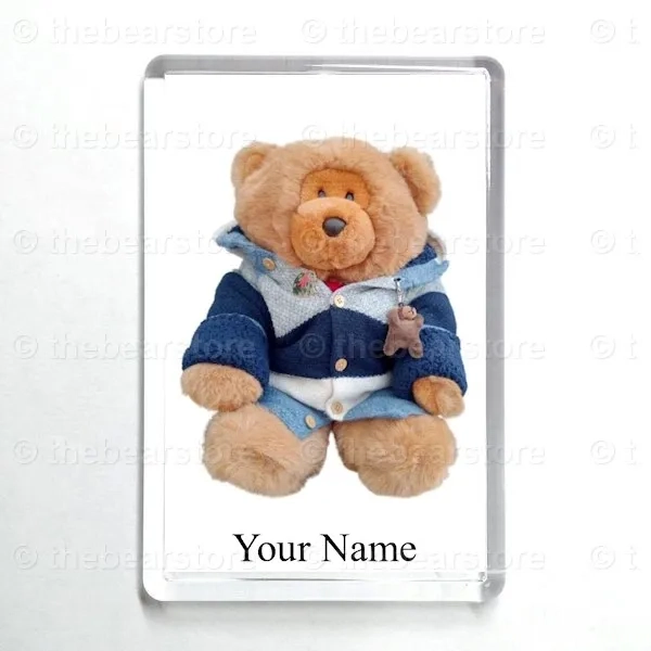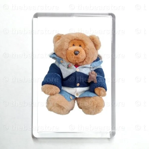 Oblong magnet featuring Cefni in his blue stripe hooded jacket.