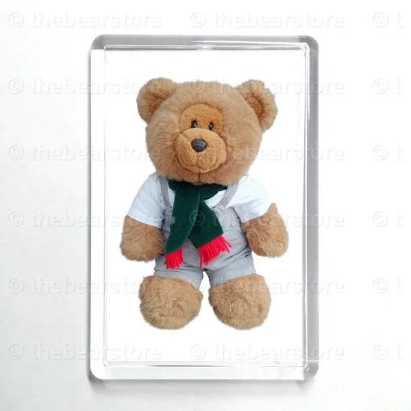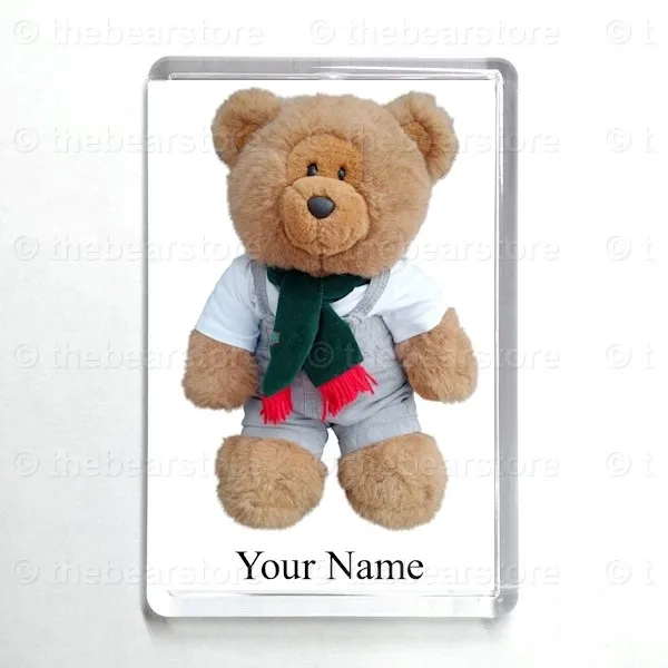 Oblong magnet featuring Harlow in his jungle beach T shirt, grey dungarees and green scarf.