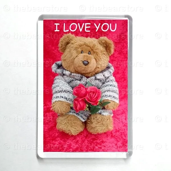 Oblong magnet featuring Billy in his winter jacket holding 3 red roses.