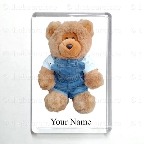 Oblong magnet featuring Leicester in his 'Winnie the Pooh' T shirt and denim dungarees.